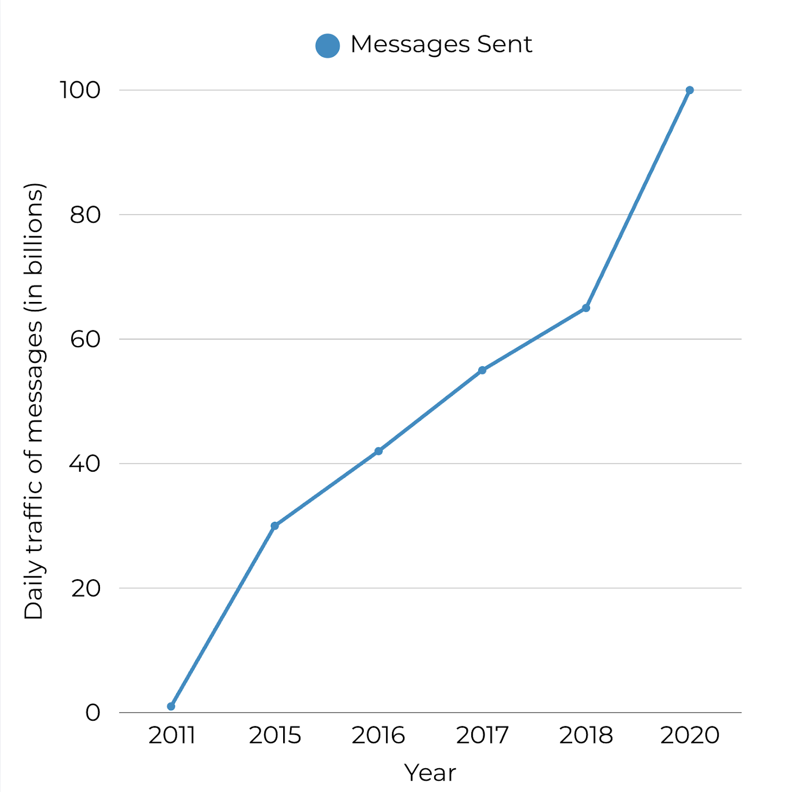 The graph above shows the amount of daily traffic sent using WhatsApp between 2011 and 2020 4